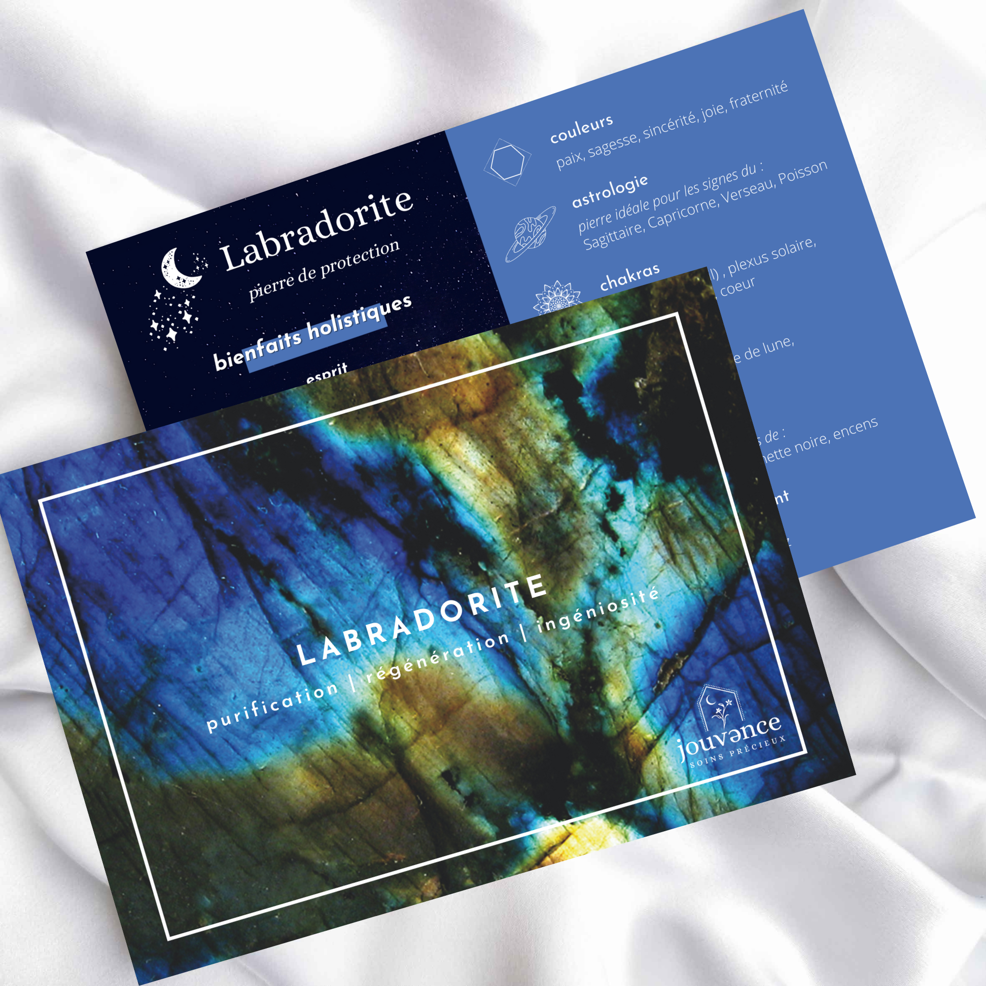 + Nous glissons dans votre colis l’une de nos “Précieuses Cartes” à collectionner, la Carte Labradorite. Elle vous en apprendra davantage sur les bienfaits, les huiles essentielles compatibles sur le plan vibratoire, et l’entretien de votre belle pierre de soin.