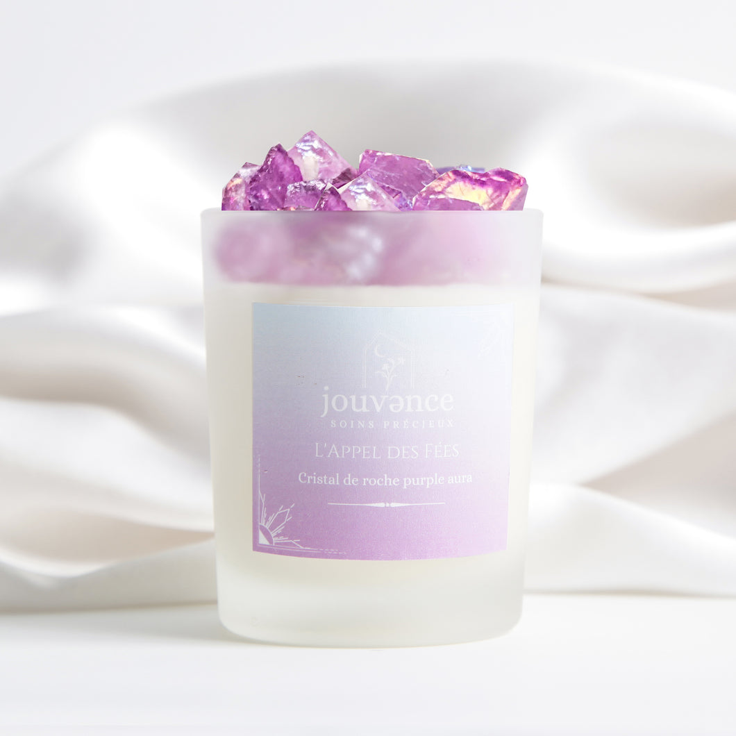 100% cire de soja, parfums de Grasse non testés sur les animaux et garantis sans CMR, phtalates et matières animales, Cristal de Roche "Purple Aura" (origine Brésil)
